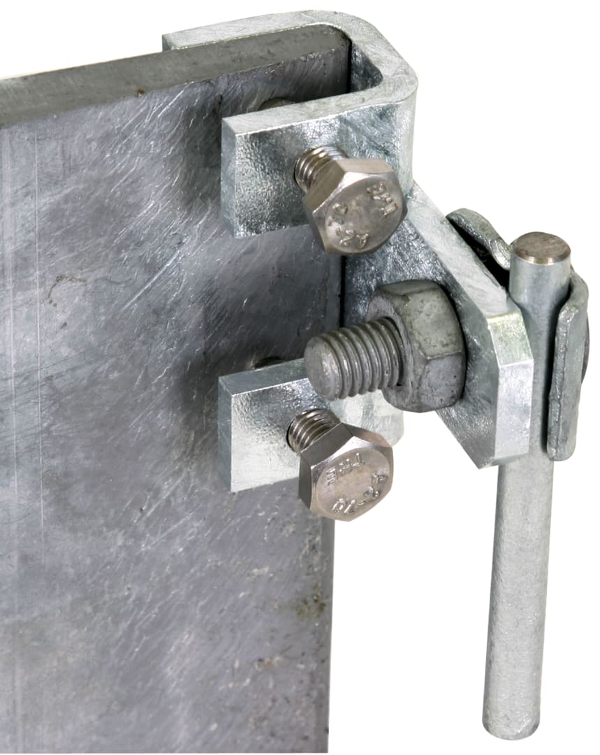 Morsetto di collegamento per travi d'acciaio secondo CEI EN 62561-1 per il collegamento su costruzioni d'acciaio. Esecuzione orizzontale con cavallotto di fissaggio, connessione longitudinale o trasversale.