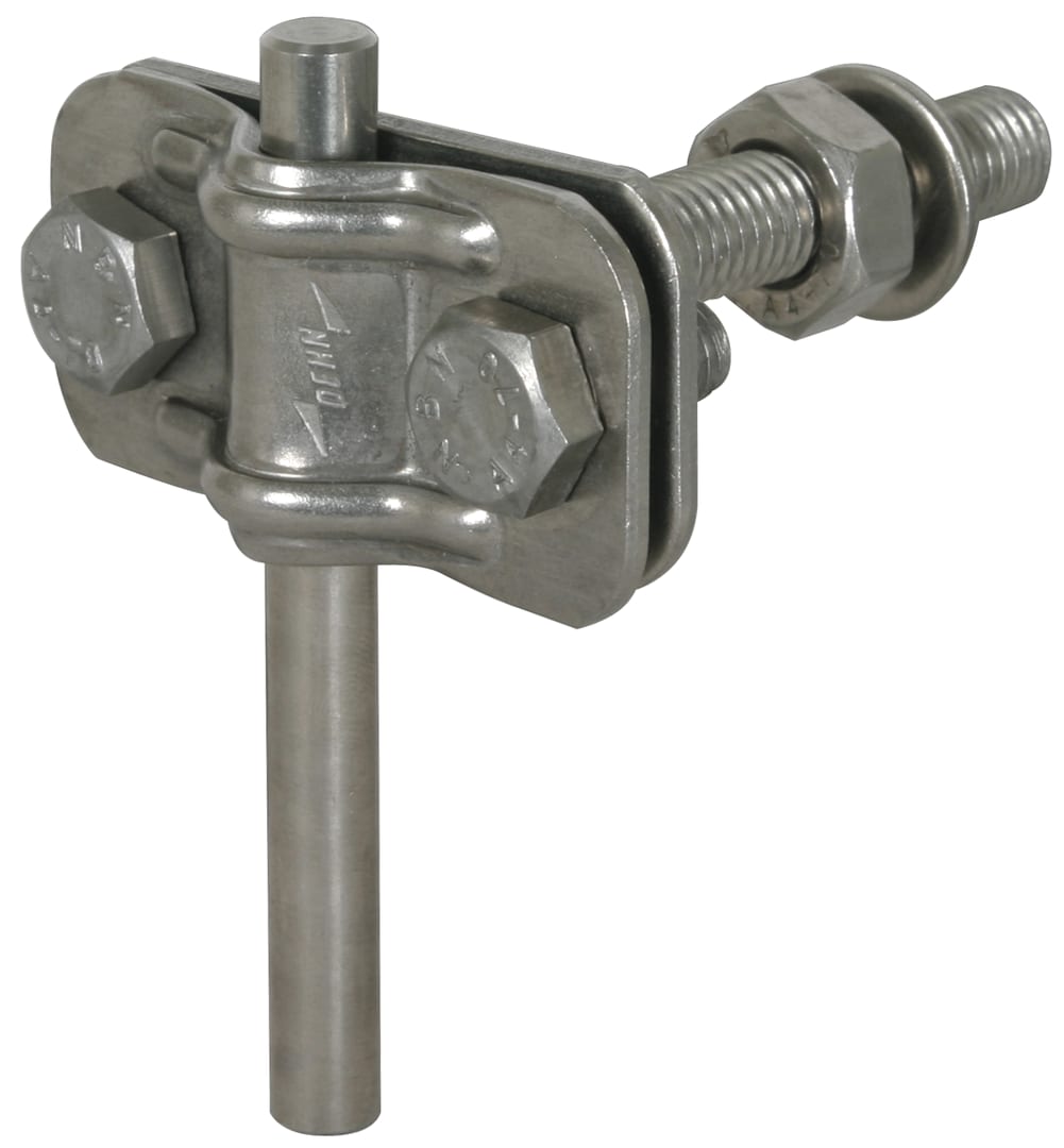 Morsetto di collegamento con perno filettato per il collegamento di conduttori Td e Pt ai punti fissi di terra con filetto M10 / 12. Adatto anche per il montaggio sul retro del punto fisso di terra senza astina di collegamento p.es. per conduttore piatto. Esecuzione leggera, con filetto di connessione M10.