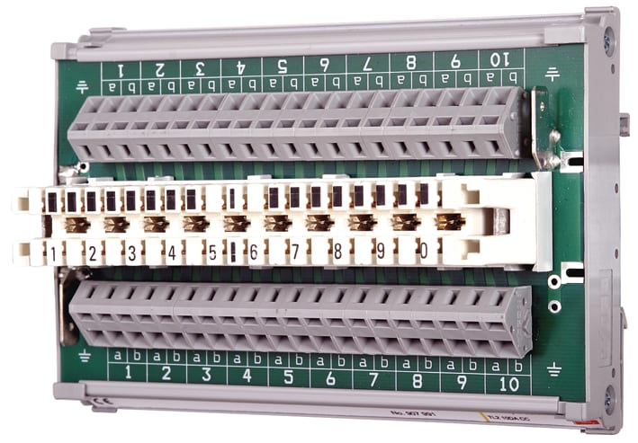 Striscia di sezionamento modulare per il montaggio su guida profilata, completa di striscia di sezionamento tipo 2/10, come morsetti a molla per la connessione variabile di fili. Adatta per l’innesto di scaricatori DPL e DEHNrapid LSA.