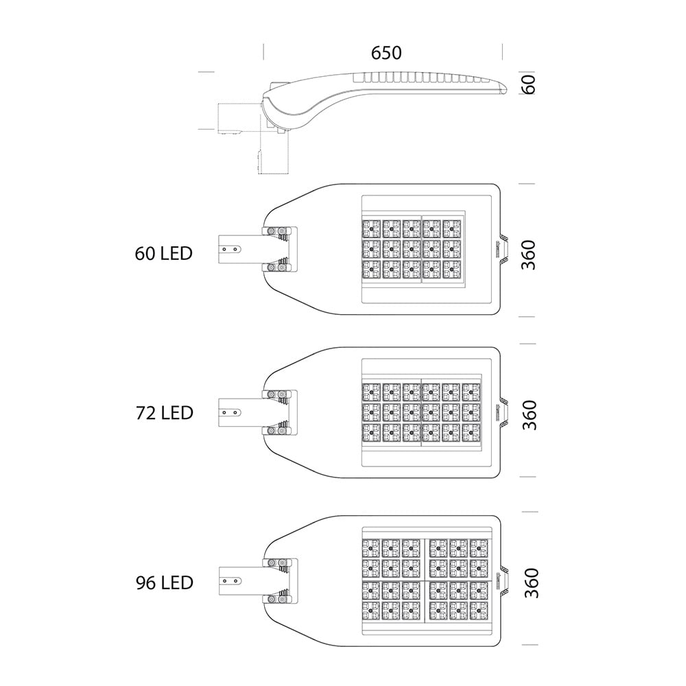 3374 Stelvio - high performance - grandi aree - Corpo e telaio: In alluminio pressofuso e disegnati con una sezione e bassissima superficie di esposizione al vento. Alette di raffreddamento integrate nella copertura. Attacco palo: In alluminio pressofuso è provvisto di ganasce per il bloccaggio dell’armatura secondo diverse inclinazioni. Orientabile da 0° a 15° per applicazione a frusta; e da 0° a 10° per applicazione a testa palo. Passo di inclinazione 5° Idoneo per pali di diametro 63-60mm. Ottiche: Sistema a ottiche combinate realizzate in PMMA ad alto rendimenti resistente alle alte temperature e ai raggi UV. Diffusore: vetro trasparente sp. 4mm temperato resistente agli shock termici e agli urti (UNI-EN 12150-1 : 2001). Verniciatura: il ciclo di verniciatura standard a polvere è composto da una fase di pretrattamento superficiale del metallo e successiva verniciatura a mano singola con polvere poliestere, resistente alla corrosione, alle nebbie saline e stabilizzata ai raggi UV. Dotazione: Dispositivo di controllo della temperatura all’interno dell’apparecchio con ripristino automatico. Dispositivo di protezione conforme alla EN 61547 contro i fenomeni impulsivi atto a proteggere il modulo LED e il relativo alimentatore. Opera in due modalità: modo differenziale: surge tra i conduttori di alimentazione, ovvero tra il conduttore di fase verso quello di neutro, modo comune: surge tra i conduttori di alimentazione, L/N, verso la terra o il corpo dell’apparecchio se quest’ultimo è in classe II e se installato su palo metallico. A richiesta: apparecchio in classe II, protezione fino a 10KV. Equipaggiamento: Completo di connettore stagno IP67 per il collegamento alla linea. Dissipatore: Il sistema di dissipazione del calore è appositamente studiato e realizzato per permettere il funzionamento dei LED con temperature inferiori ai 50° (Tc = 25°) garantendo ottime prestazioni/rendimento ed un’ elevata durata di vita. Ottiche: Sistema a ottiche combinate realizzate in PMMA ad alto rendimento resistente allealte temperature e ai raggi UV. Recuperatori di flusso in policarbonato V2. Tecnologia LED di ultima generazione Ta-30+40°C vita utile 80%: 50.000h (L80B20). Classificazione rischio fotobiologico: Gruppo di rischio esente. Fattore di potenza >0.9. LED 152W 18792lm 350mA 4000K CRI 70. Antracite.