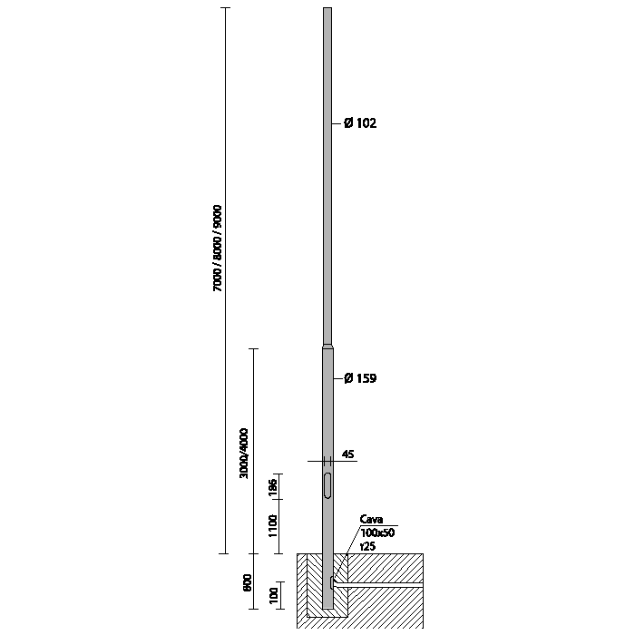 Palo in acciaio zincato a caldo spessore 4mm. Con finestra d'ispezione in alluminio pressofuso (186x45mm), completo di 2 portafusibile di protezione, 2 fusibili da 16A, morsettiera asportabile a 4 poli. Predisposto con foro per ingresso cavo di alimentazione. Per la versione con base è necessario acquistare 4 tirafondi da interrare, bulloneria e tappi. N.B.: La possibilità di accoppiare una composizione al palo è subordinata alla verifica della resistenza alla spinta del vento, nelle zone del territorio previste dal D.M.14/01/2008. Secondo le ipotesi di carico previste dalle norme EN 40-3-1.Si consiglia di effettuare un’ accurata e idonea protezione o isolamento delle superfici interessate e che non ci sia contatto diretto con la muratura fresca o il massetto