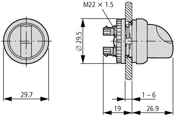 Selettore luminoso, Gamma di prodotti: RMQ-Titan, Apparecchio singolo, Progettazione: Con maniglia, ritentivo, 2 posizioni, colore maniglia: rosso, grado di protezione: IP66, Ghiera frontale colore nero, Collegamento a SmartWire-DT: sì, con collegamenti SWD-RMQ, Dimensioni frontali: 29,7, Istruzioni: Funzionalità stabile/instabile, sostituibile con parti con codice M22-XC-Y, Conformità alle norme: IEC/EN 60947, VDE 0660, Grado di protezione: IP66