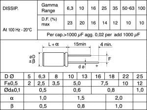 CONDENSATORI ELETTROLITICI VERTICALI 2000 ORE - 105°C. GAMMA TENS.:16÷250 V. TEMP. LAV.: -40°C÷+105°C. TOLL.:±20% a 120 Hz-20°C. CORR. PERD.:I=0,01 CV o 3 µA dopo 1 min. Cap. Elettr. 220 UF.