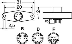 PRESE MINI DIN. CORPO:bachelite. CONTATTI:ottone. TEMP. LAV.:-20°C ÷ +80°C. PER SPINE:5/2848.