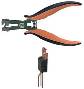 PINZA PROFESSIONALE PER LA PREFORMATURA A PASSO DEI REOFORI. Studiata appositamente per preformare a passo i reofori del tipo TO 220-TO 202, ecc. MATERIALE:acciaio brunito. RIVESTIMENTO:pvc.