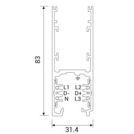 EUROSTANDARD PLUS TRACK DALI H. Nel binario sono alloggiati i conduttori, racchiusi in profili estrusi rigidi di materiale isolante ad alta rigidità elettrica. I 3 conduttori di fase con il neutro comune formano 3 circuiti distinti permettendo 3 accensioni separate. Alimentando il binario alla rete monofase il carico massimo applicabile è di 16A (3500 VA) suddivisibile nei 3 circuiti. L’allaccio alla rete elettrica trifase permette un carico complessivo di 16A (10500 VA) suddivisibile nei 3 circuiti (3x3500 VA). La posizione laterale del contatto di terra rende la struttura del binario asimmetrica e pertanto i giunti di collegamento dovranno essere scelti diconseguenza. Realizzato in alluminio. Colore: Bianco RAL 9003. RDD: Il cablaggio di serie è 230-240V/50-60Hz, elettronico dimmerabile predisposto per la regolazione con segnale DALI. Dimensone: 2mt.