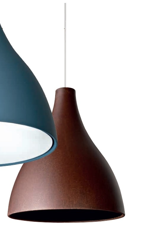 Apparecchio a sospensione con sorgente luminosa a LED. Corpo e rosone in alluminio tirato verniciato esternamente rosso mattone, che si ottiene tramite un processo naturale di ossidazione successivamente protetto tramite una verniciatura trasparente opaco. Sorgente Luminosa: LED 26W 3300Lm 3000K.