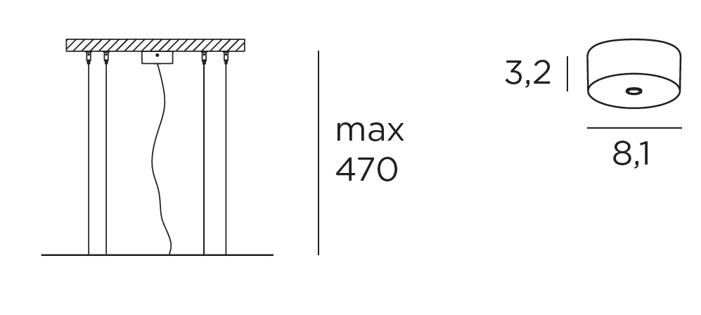 Kit sospensione con rosone in policarbonato bianco lucido, cavo elettrico 3x0,75mm² e cavi di sospensione in acciaio completi di regolazione micrometrica “Griplock”.Kit per montaggio a sospensione “biemissione”. Per versione: ø95, 125cm.