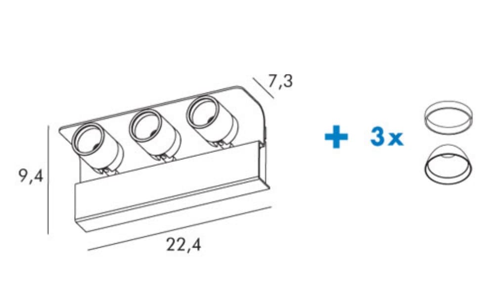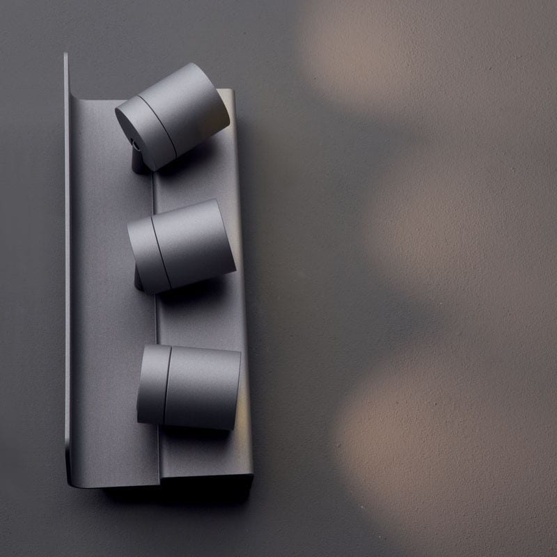 Apparecchio a parete o soffitto con 3 spots LED orientabili. Corpo in alluminio verniciato grigio cemento. Ogni spot deve essere completato con anello decorativo accessorio completo di ottica. Sorgente Luminosa: LED 3X9W 3600Lm 3000K.