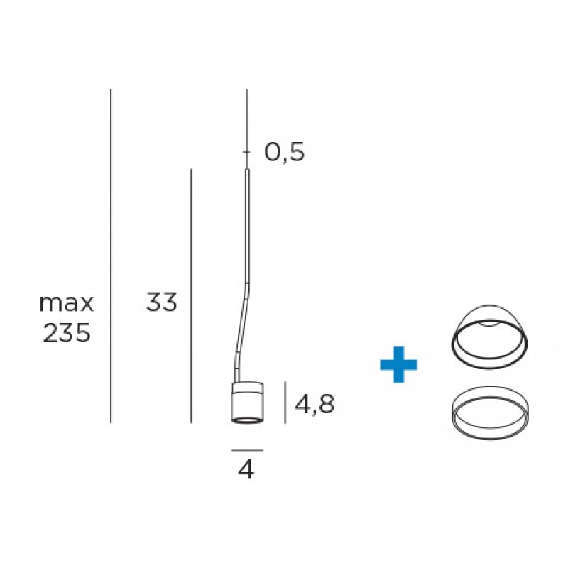 Apparecchio a sospensione con sorgente luminosa a LED. Corpo in alluminio verniciato grigio cemento. Ogni spot deve essere completato con anello decorativo accessorio completo di ottica. Sorgente Luminosa: LED 3,5W 550Lm 3000K.