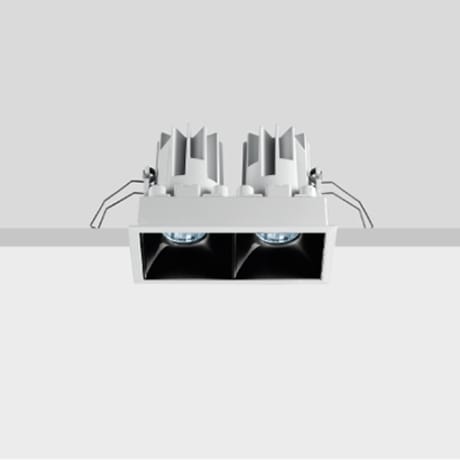 Apparecchio ad incasso a due vani ad ottica fissa per sorgenti LED warm white ad elevato indice di resa cromatica. Sistema passivo di dispersione termica. Corpo lampada con superficie radiante in alluminio pressofuso, versione con cornice perimetrale di battuta. Ottiche ad alta definizione in termoplastico metallizzato, integrate in posizione arretrata negli schermi antiabbagliamento. Vetri di protezione per sorgenti LED. La composizione strutturale del sistema ottico permette di ottenere un'emissione a luminanza controllata (UGR < 19). Due alimentatori dimmerabili DALI forniti in dotazione collegati all'apparecchio; questa soluzione consente di ottenere accensioni separate dei vani luminosi. LED 17W 1850lm. Warm 3000K CRI 90. Driver Elettronico DALI dimmerabile incluso. Ottica: WF - Wide Flood 54°. Orientabilità: Fisso. Materiale: alluminio e tecnopolimero. Dimensioni (mm): 155x85x105, Peso (kg): 1,00. Colore: bianco.
