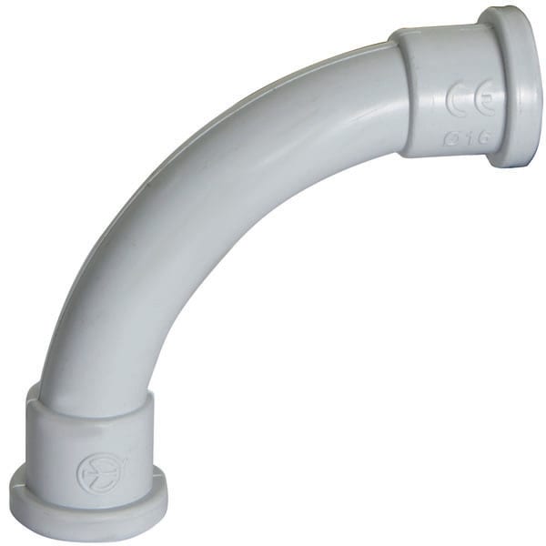 Curva a 90° per tubi rigidi di diametro 16 mm, autoestinguente UL94: V0,realizzata in PVC rigido grigio RAL 7035. Gradi di protezione IP65, resistente ai raggi UV e al filo incandescente GWT 850°C (EN 60695-2-11). Assicura un’installazione sicura e affidabile sia indoor che outdoor.