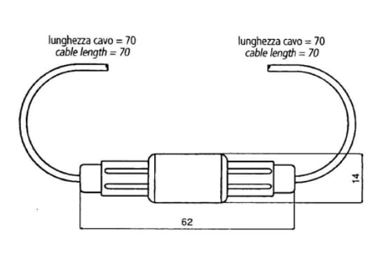 Costruiti in materiale termoplastico, con o senza cavi di collegamento. Sono forniti senza fusibile. Portafusibili volanti per fusibili 5X20 E 6,3X32. Unione: a vite. Cavi: lungh. 70 mm - sez. 1,5 mm2 . Corpo: in materiale termoplastico autoestinguente. Contatti: ottone con capicorda. Fissaggio filo: due molle di pressione. Dimensioni fusibile: 5x20 e 6,3x32 mm