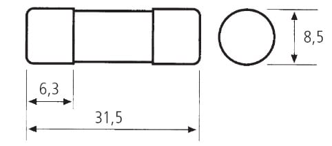 Corpo in steatite adatto a sopportare sbalzi termici molto elevati, riempito di sabbia di quarzo. L’elemento di fusione è composto da una lamina di rame ricoperta in argento. La doppia capsula ricoperta d’argento evita l’ossidazione e mantiene le caratteristiche immutate nel tempo. Tutti i fusibili cilindrici sono progettati per ridurre al minimo la potenza dissipata il cui valore è indicato sul corpo del fusibile stesso. Fusibili CH. Grandezza : CH8 (8,5x31,5)