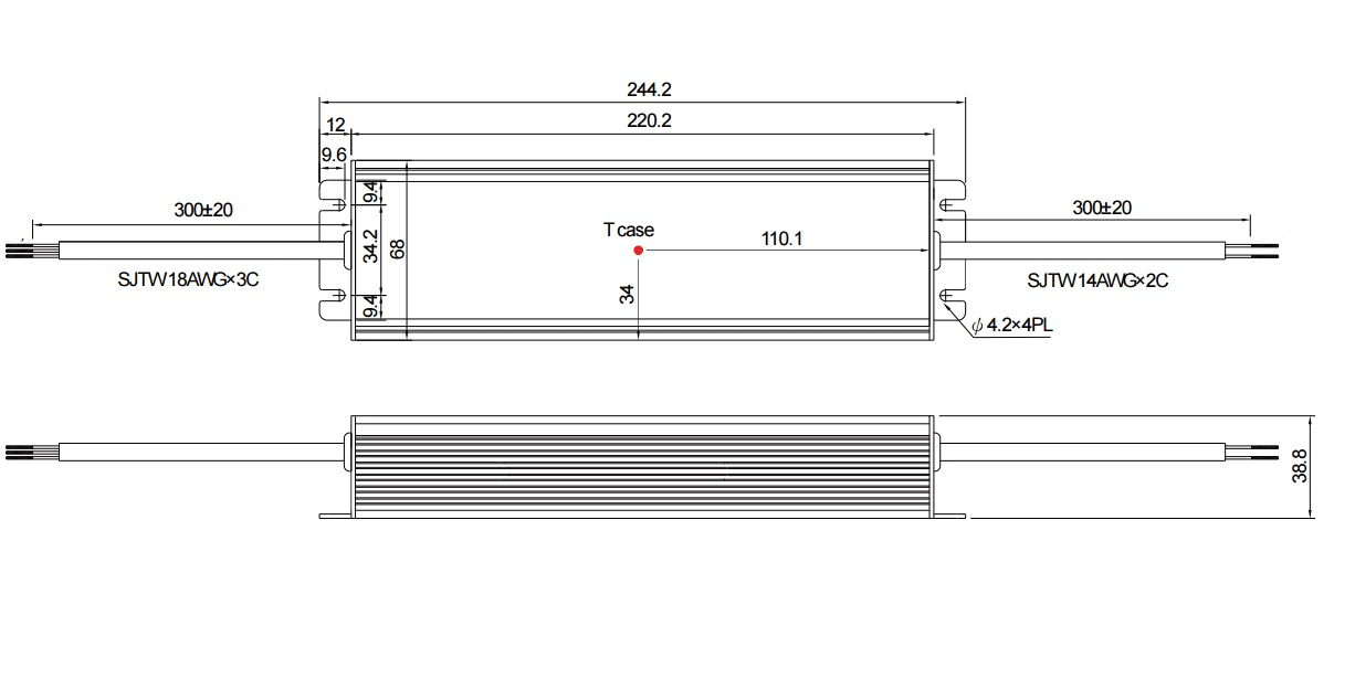 Alimentatore LED 90—305V 47—63Hz 127—431Vdc 240W 48VDC. Dimensioni: 245x68x39 mm. IP67.