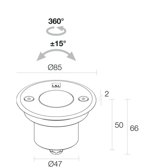 Incasso da esterno (non adatto per immersione in piscine e fontane); a incasso (soffitto, parete, pavimento); 2,5W. Flusso sorgente: 145 lm. 4000 K. 36°. Colore inox. Tondo