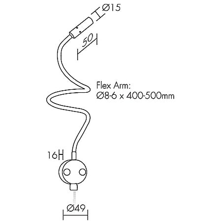 Lampada da lettura; 1W - 230Vac 50Hz; 1 power LED; 3000K; CRI: 75÷85; ottica variabile e regolabile; flusso totale: 83 lm (3000K a 500mA); corpo in ottone, schermo in PMMA; finitura: cromato; temperatura di esercizio: 0°C +45°C; grado di protezione contro i liquidi e i corpi solidi: IP20; sicurezza fotobiologica: gruppo rischio 1 secondo EN62471:2006; montaggio su frutto cieco della placca standard, mediante apposita piastrina di fissaggio; classe di isolamento II; peso 0,16kg Ø8 500mm; dimensioni ø15x50mm, stelo flessibile ø8x500mm; collegamento 230Vac 50Hz, con 30cm di cavo bipolare e alimentatore; alimentatore in dotazione da alloggiare in scatola standard 503.