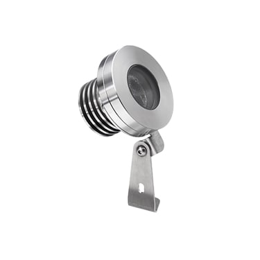 Spot 2.6 316L - Proiettore da esterno e immersione orientabile 210°; su superficie (soffitto, parete, pavimento, picchetto); profondità massima 10 m; corpo e ghiera in acciaio inox AISI 316L; schermo in vetro temprato; 3 power LED; 6W (3 power LED x 2W) - 24Vdc; incluso cavo in neoprene di 5 m H05RN-F 2x0,75/0,75 Ø6,3 mm; ottiche: 38°; colore LED: bianco - 5000K; grado di protezione: IP68; grado di resistenza: IK10; dotato di sistema IPS; temperatura di esercizio: -10°C+45°C; temperatura schermo: max 30°C (Ta 25°C); Glow wire test: 960°; sicurezza fotobiologica: gruppo rischio 1 secondo EN62471:2006; classe di isolamento III; peso 0,95 kg; dimensioni ø69x60mm, h 135 mm; dimmerazione disponibile mediante dimmer in linea 24Vdc; accessori: picchetto WP0100.LED bianco 6W 5000K 38°.