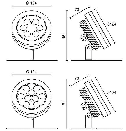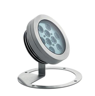 Proiettore orientabile da esterno o immersione; 18W - 24Vdc; 9 power LED; 5000K; CRI: 75÷85; ottica: 40°; corpo e ghiera in Acciaio Inox AISI 316L, schermo in vetro extrachiaro temprato con trattamento antigraffio di spessore 10mm; finitura: Acciaio InoxAISI 316L lucidato; temperatura di esercizio: -10°C +45°C; dotato di sistema IPS (utilizzare corrugato Ø20 min); grado di protezione contro i liquidi e i corpi solidi: IP68; grado di resistenza all'impatto IK09; Glow wire test: 960°; sicurezza fotobiologica: gruppo rischio 1 secondo EN62471:2006; montaggio con staffa, vite e tassello, accessorio picchetto WP0100 per installazione nel terreno; classe di isolamento III; peso 1,50kg; dimensioni Ø124x70mm ; h 151mm; collegamento in parallelo, RGB collegamento in serie, cablato con cavo 5m tipo H05RN-F 2x0,75; accessori disponibili: picchetto WP0100.