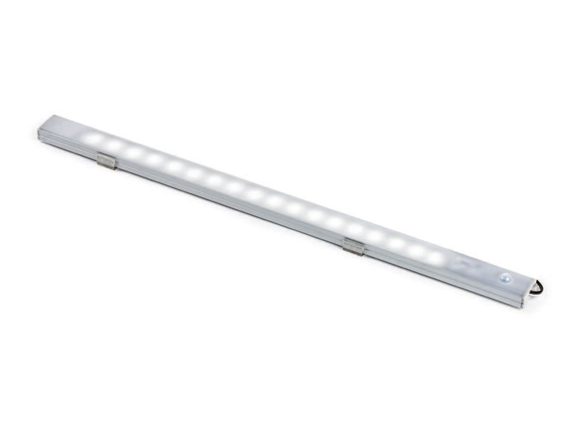 Mini plafoniera LED 12VDC con sensore di prossimità PIR. Portata sensore 5 metri 120°. Durata accensione 20’’ il primo ciclo, 50’’ i cicli successivi. Corpo in alluminio. Diffusore in policarbonato opaco. Consigli per utilizzo a richiesta modello/misure/potenza personalizzate per minimo 10 pezzi. Tensione costante: utilizzare converter 12V. LED 3528 SMD 5,5W 360lm/m 4500K CRI >80 - 120°. Finitura silver. Dimensioni: 1150x23,5x10 mm.