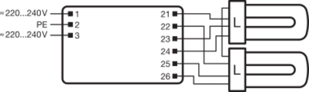 Alimentatore elettronico per CFL (ECG). Caratteristiche prodotto: Tensione di alimentazione: 220…240 V. Tensione di linea: 198…264 V. Frequenza di linea: 0 Hz | 50 Hz | 60 Hz. Accensione lampada con preriscaldamento ottimale del filamento. Indice di efficienza energetica EEI: A2 BAT. Spegnimento automatico delle lampade difettose al termine della vita (EoL T.2). Funzionamento lampada: in conformità alla norma EN 60929. Sicurezza: a norma EN 61347-2-3. Vantaggi prodotto: Lunga durata della lampada. Nessuna ripercussione negativa per cicli di accensione/spegnimeto frequenti. Riaccensione automatica dopo la sostituzione della lampada. Perfetta accensione della lampada per applicazioni con sensori di movimento. Sistema certificato VDE/VDE EMC. Altissima efficienza energetica grazie alla tecnologia cut-off. Aree applicative: Impianti di illuminazione di emergenza a norma EN 50172 / DIN VDE 0108-100. Uffici open space, corridoi e ripostigli. Edifici pubblici. Adatto per apparecchi di illuminazione in classe diisolamento I e II.