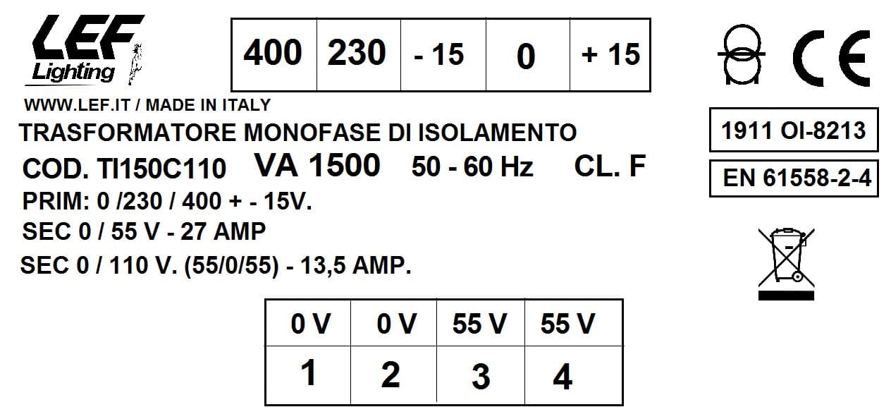 L.E.F. SRL - LEFTI150C110 T.M. 1500VA 230.400V / 55?110V - TI150C110