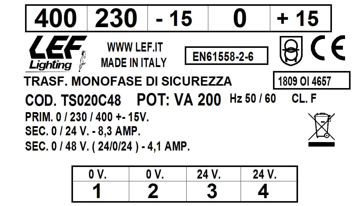 L.E.F. SRL - LEFTS020C48 T.M. 200VA 230.400V / 24?48V - TS020C48