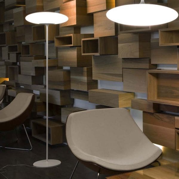 Una lampada una piantana dalle dimensioni generose, come un dirigibile luminoso che si staglia nel cielo. Materiali: diffusore in polietilene lineare bianco traslucido; corpo e montatura in metallo verniciato bianco raggrinzante.