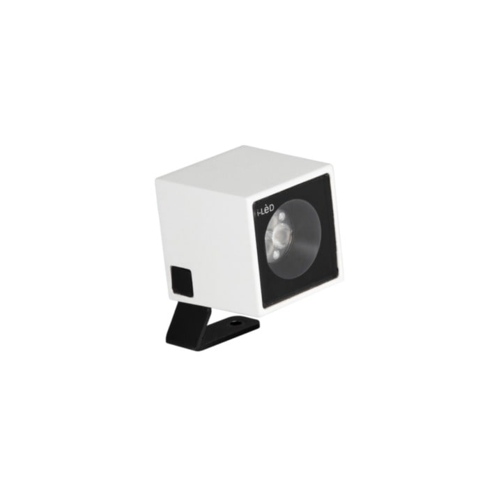 Proiettori a singola emissione per applicazione outdoor. La sorgente luminosa LED, di colore bianco caldo, con distribuzione luminosa Spot, è composta da 1 LED powerled, con una CCT 3000 K ed un CRI 80; il flusso luminoso della sorgente è di 659 lm, con un'efficienza nominale di 109.8 lm/W. Il corpo dell'apparecchio, realizzato in alluminio pressofuso en ab - 46100, presenta una finitura di colore bianco ral 9003 goffrato, ottenuta tramite anodizzazione poro aperto + verniciatura a polvere; il diffusore è prodotto in vetro extra chiaro - temprato, con una lavorazione di serigrafia. Il grado di protezione è IP66; il peso complessivo è di 0.25 kg. Il driver d’alimentazione non è fornito e deve essere ordinato separatamente. La potenza assorbita dall'apparecchio è di 6 W.