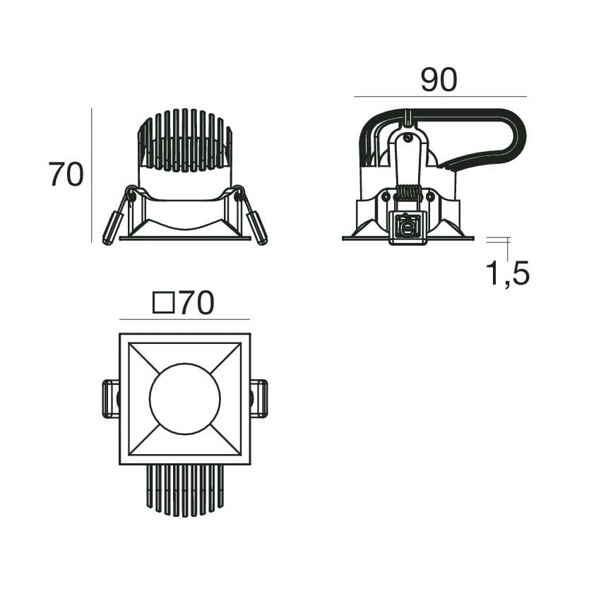 Downlights a singola emissione per applicazione indoor. La sorgente luminosa LED, di colore bianco naturale, con distribuzione luminosa Medium Flood, è composta da 1 LED arrayled, con una CCT 4000 K ed un CRI 95; il flusso luminoso della sorgente è di 842 lm, con un'efficienza nominale di 105.3 lm/W. Il corpo dell'apparecchio, realizzato in alluminio, presenta una finitura di colore oro, ottenuta tramite verniciatura. Il grado di protezione è IP44; il peso complessivo è di 0.26 kg. Il driver d’alimentazione non è fornito e deve essere ordinato separatamente. La potenza assorbita dall'apparecchio è di 8 W. Il cavo per l'alimentazione è incluso e presenta. L'apparecchio presenta una classe di isolamento III ed è installabile a soffitto, con foro quadrato con misura 64 x 64 mm (nel cartongesso).
