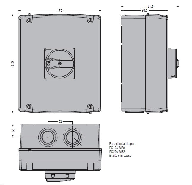 CONTENITORE VUOTO TIPO IEC/EN IP65, PER INTERRUTTORI SEZIONATORI. CON MANIGLIA GIALLO/ROSSA, PER GA063 SA, GA063 A...GA100 A