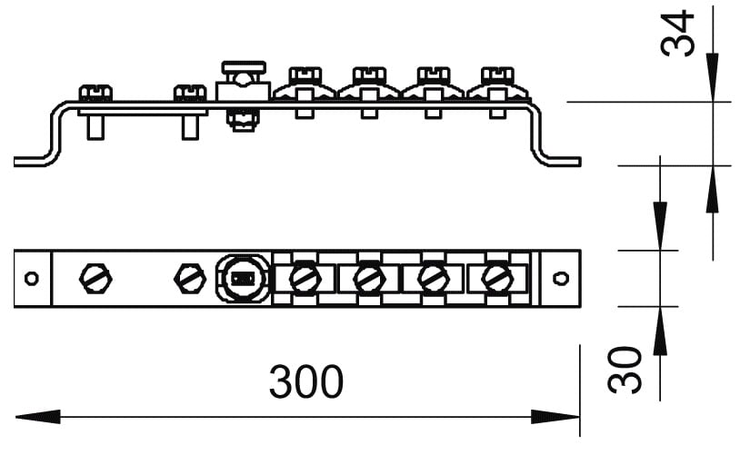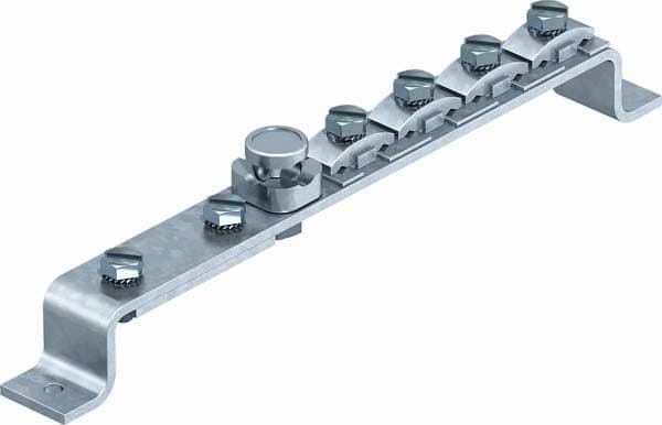 Piastra equipotenziale senza coperchio; In acciaio zincato galvanicamente. Terminali in ottone. Collegamenti: 8 conduttori fino a 25 mm2; 1 tondo Ø 8 ÷ 10 mm; 1 piatto da 40 mm.