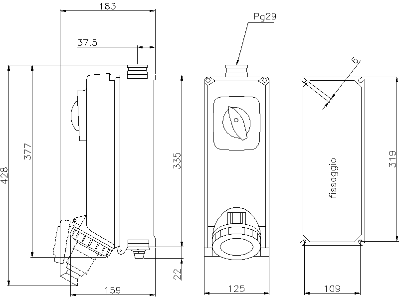Presa da parete con interruttore magnetotermico, blocco meccanico, spia di segnalazione intervento, in contenitore modulare isolante termoindurente IP67 >IK10. Manopola lucchettabile. Ingresso M25. Predisposta per l'ingresso dal basso.
