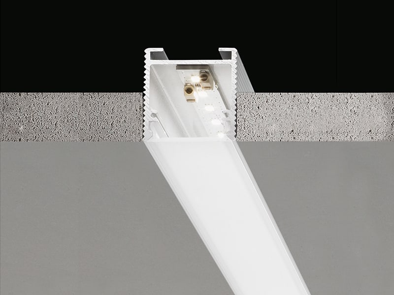 Profilo componibile per installazione incassata a soffitto o parete in ambienti interni, con emissione diretta. Struttura a scomparsa per l'incasso in cartongesso, in alluminio estruso con verniciatura a polvere in colore bianco RAL 9003. Schermo diffusore in policarbonato estruso con finitura opalina. Fornito completo di schermo monouso per rasatura, stuccatura e verniciatura della superficie di installazione. Moduli luminosi e alimentatore da ordinare separatamente. Accessori di fissaggio, giunzione e chiusura da ordinare separatamente. Dimensione del foro di incasso: 2015x40mm (40x1,6"). Sorgente luminosa LED. Distribuzione luminosa fascio diffuso. Alimentazione 24V DC. Driver remoto non incluso. Peso 0,8300Kg. Grado di protezione IP40.