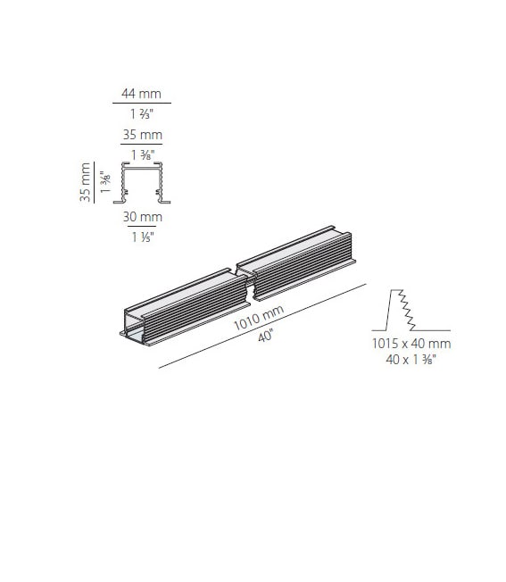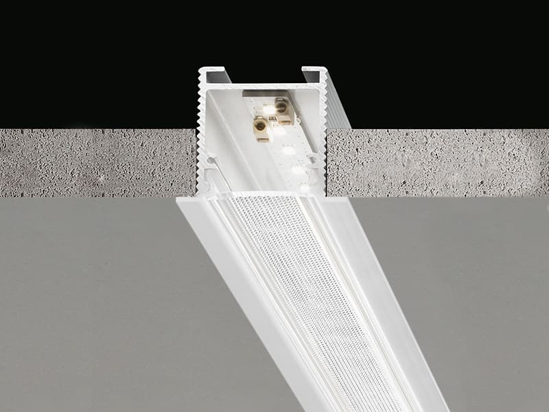 Profilo componibile per installazione incassata a soffitto o parete in ambienti interni, con emissione diretta. Struttura per l'incasso in cartongesso, in alluminio estruso con verniciatura a polvere in colore bianco RAL 9003. Schermo diffusore in policarbonato estruso con finitura opalina. Moduli luminosi e alimentatore da ordinare separatamente. Accessori di fissaggio, giunzione e chiusura da ordinare separatamente. Dimensione del foro di incasso: 1015x40mm (40x1,6"). Potenza assorbita dal sistema max 46W/m. Sorgente luminosa LED. Distribuzione luminosa fascio diffuso. Alimentazione 24V DC. Driver remoto non incluso. Peso 0,6650Kg. Grado di protezione IP40.