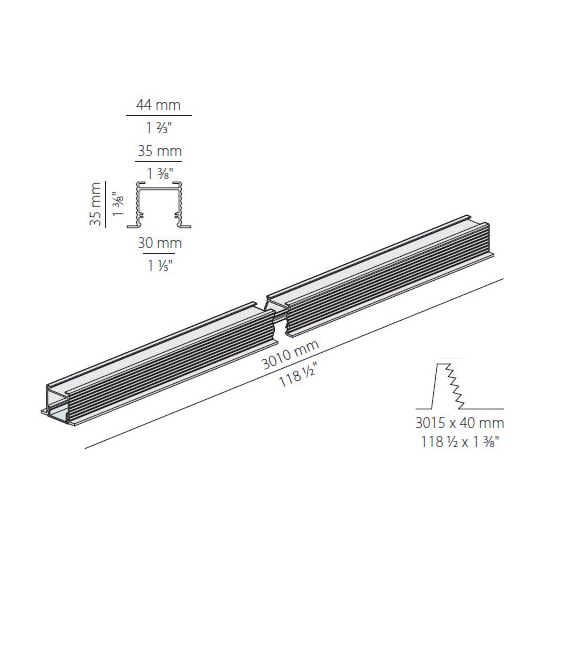 Profilo componibile per installazione incassata a soffitto o parete in ambienti interni, con emissione diretta. Struttura per l'incasso in cartongesso, in alluminio estruso con verniciatura a polvere in colore bianco RAL 9003. Schermo diffusore in policarbonato estruso con finitura opalina. Moduli luminosi e alimentatore da ordinare separatamente. Accessori di fissaggio, giunzione e chiusura da ordinare separatamente. Dimensione del foro di incasso: 3015x40mm (40x1,6"). Potenza assorbita dal sistema max 46W/m. Sorgente luminosa LED. Distribuzione luminosa fascio diffuso. Alimentazione 24V DC. Driver remoto non incluso. Peso 0,6650Kg. Grado di protezione IP40.