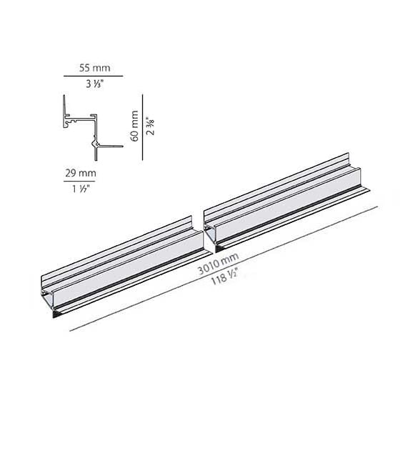 Profilo componibile per installazione incassata a soffitto o parete in ambienti interni, con emissione indiretta. Struttura a scomparsa per l'incasso in cartongesso, in alluminio estruso con verniciatura a polvere in colore bianco RAL 9003. Dissipatore in alluminio estruso. Schermo diffusore in policarbonato estruso con finitura opalina. Moduli luminosi e alimentatore da ordinare separatamente. Accessori di fissaggio, giunzione e chiusura da ordinare separatamente. Potenza assorbita dal sistema max 25W/m. Sorgente luminosa LED. Distribuzione luminosa fascio diffuso. Alimentazione 24V DC. Driver remoto non incluso. Peso 1,4450Kg. Grado di protezione IP20. 3010 mm
