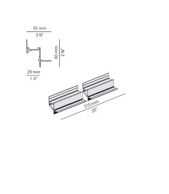 Profilo componibile per installazione incassata a soffitto o parete in ambienti interni, con emissione indiretta. Struttura a scomparsa per l'incasso in cartongesso, in alluminio estruso con verniciatura a polvere in colore bianco RAL 9003. Dissipatore in alluminio estruso. Schermo diffusore in policarbonato estruso con finitura opalina. Moduli luminosi e alimentatore da ordinare separatamente. Accessori di fissaggio, giunzione e chiusura da ordinare separatamente. Potenza assorbita dal sistema max 25W/m. Sorgente luminosa LED. Distribuzione luminosa fascio diffuso. Alimentazione 24V DC. Driver remoto non incluso. Peso 1,4450Kg. Grado di protezione IP20. 510 mm