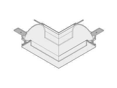 Elemento di collegamento per due linee di profili componibili con angolo 1 di giunzione piano esterno di 90° per installazione incassta a scomparsa parete-parete / soffitto-soffitto misure esterne 110x110mm. Bianco opaco.