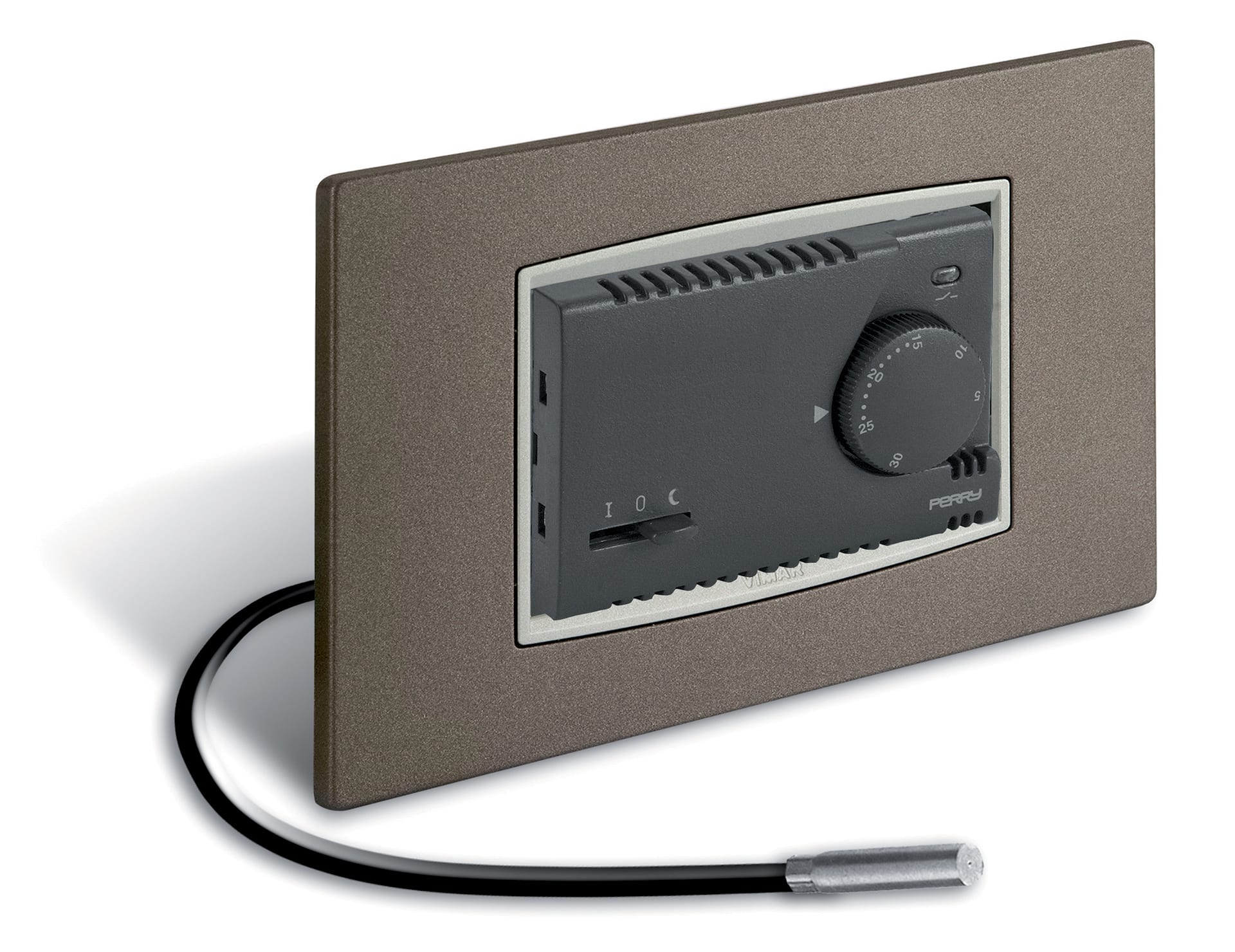 Termostato elettronico da incasso Perry 1TI TE305 MC serie MODULO con Sonda a Pavimento tipo NTC con filo 4 metri Comando ON/OFF/RIDUZIONE NOTTURNA Campo regolazione 0-60°C inclusi 3 frontalini bianco grigio antracite Alimentazione 230V c.a. 50-60 Hz