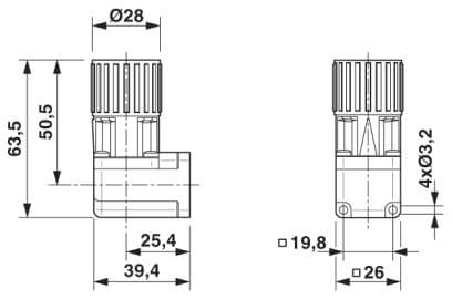 Connettore per apparecchi anteriore con dado zigrinato, angolato, fisso, Bloccaggio a vite, M23, numero poli: 4+3+PE, tipo contatti: femmina, Attacco a crimpare, O-ring assiale, 4x Ø 3,2, schermata: sì, misura flangia: 26 mm x 26 mm