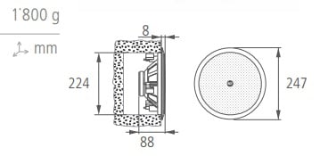 PL 8X Plafoniera coassiale. Diffusore acustico a plafoniera dal design elegante ed esclusivo, indicato per essere installato ad incasso in controsoffittature o pannelli. Impiega altoparlante da 200 mm-8” con tweeter coassiale da 25 mm (1”) montato su un supporto a ponte. È corredato di un trasformatore di linea che consente il colllegamento diretto ad impianti a tensione costante a 70 V o 100 V. Grazie alle prese multiple del trasformatore di linea è possibile selezionare la potenza da diffondere fra diversi valori disponibili. L’installazione a soffitto è semplice e veloce grazie ad un particolare sistema a tre ganci rotanti che evita l’impiego di viti e tasselli o altri elementi di fissaggio.