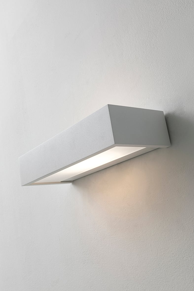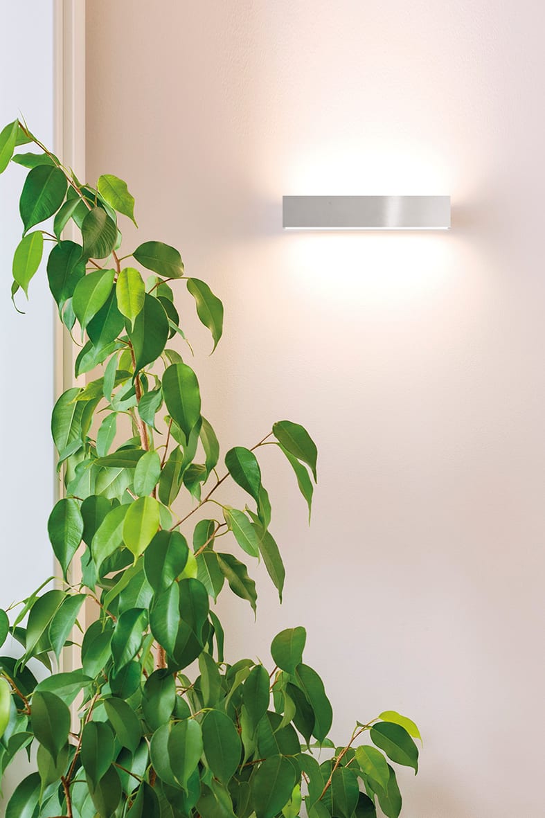 Lampada da parete biemissione lineare in alluminio spazzolato con diffusore in vetro satinato. Propo sta in due diverse misure e relative potenze, conattacco R7s, che consente di montare lampadina LED e in due finiture (alluminio e bianco).