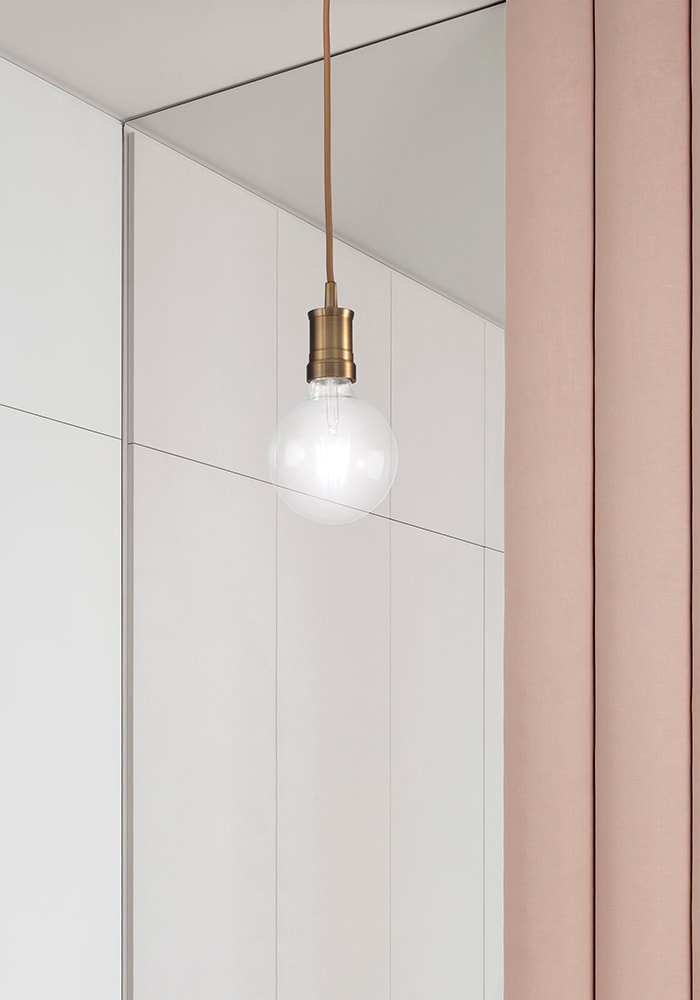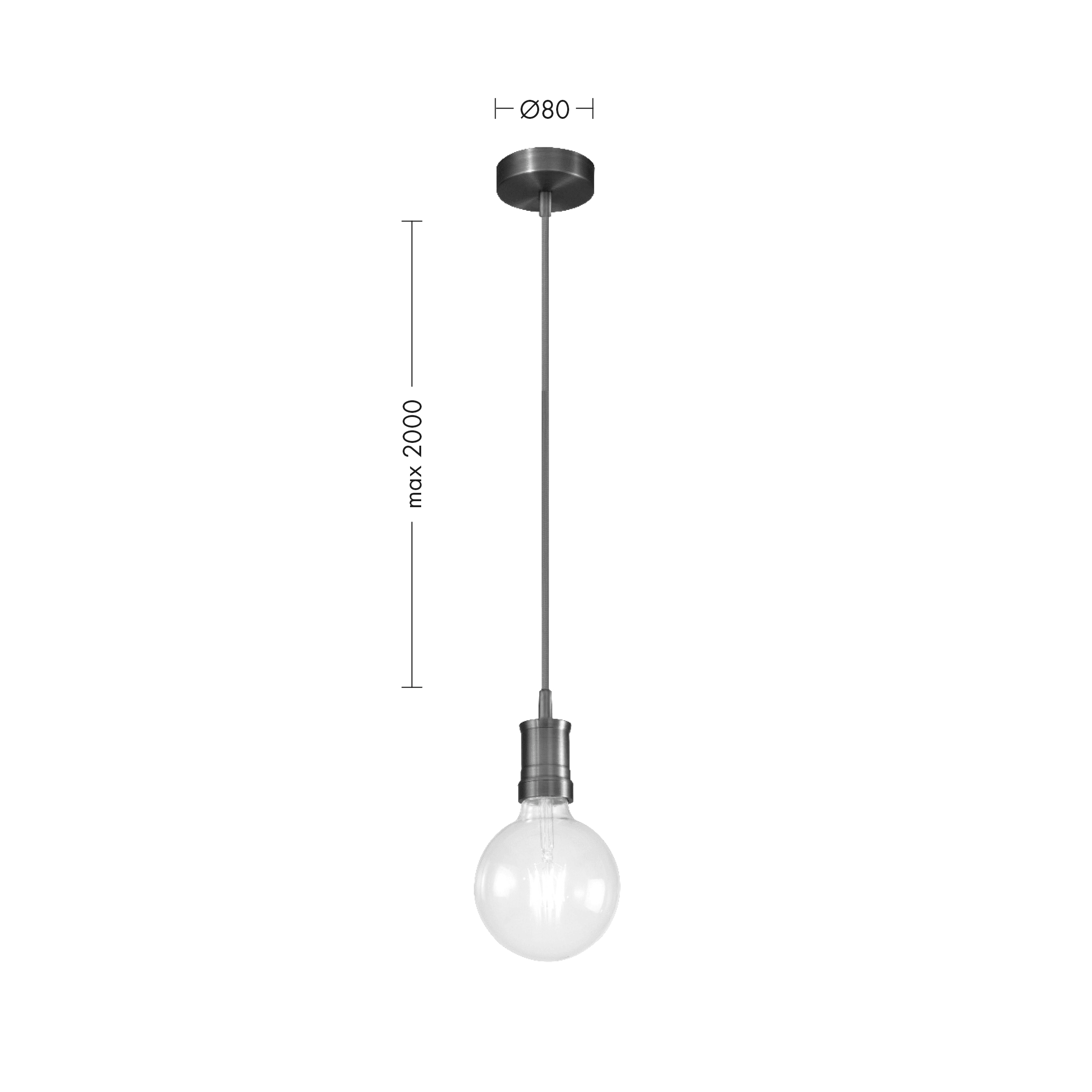 Lampada a sospensione singola con portalampada e rosone in metallo color bronzo, cavo in tessuto intinta. Attacco E27 con lampadina a vista, che consente all'utente di montare una lampadina a sua scel ta, personalizzando ulteriormente il prodotto.