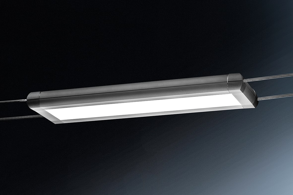 Sistema a tesata con coppia di cavi con interasse160mm: permette di installare apparecchi con fonte luminosa con LED integrato o con attacco tradizionale (GU10, R7s, E27 che consentono di montare lampadina LED). Corpi illuminanti da posizionare secondo le esigenze di installazione in estruso di all uminio (verniciato bianco opaco o grigio opaco) ediffusore in policarbonato. Disponibili in versione luce diffusa, monoemissione o biemissione o a sp ot con corpo illuminante orientabile su due assi.LED disponibile in due gradazioni (3000K e 4000K).