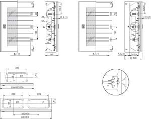 Telaio modulare DLM per cassette PanelSeT con montaggio a parete. A 800 x L 600 mm, 112 moduli (18 mm). Applicazione di distribuzione modulare multifunzione. Guida scorrevole, lato frontale della cassetta. Regolazione in altezza da 40 a 85 mm per la guida DIN. In acciaio. Grigio RAL 7035. 2 coperchi di finitura, 1 striscia di neutro/terra 2 x 16 mm² 5 x 6 mm², 3 pannelli frontali (guida DIN 35 mm).