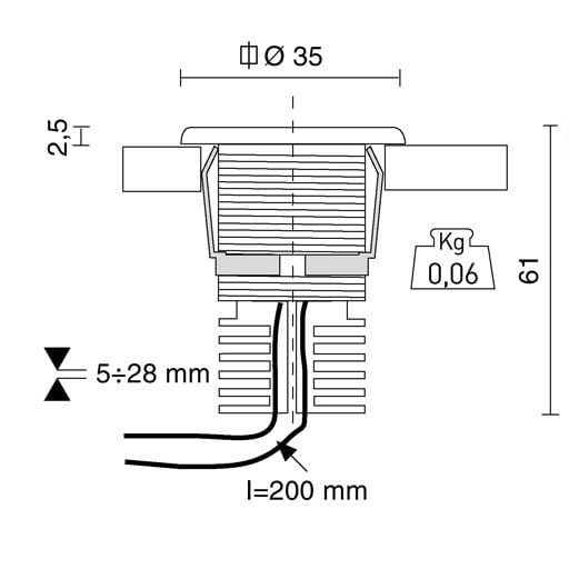 installazione: Incasso a Soffitto/Parete. foro incasso: Foro di incasso diam.28 mm. Spessore controsoffitto: 5-28 mm. fissaggio: Molle in acciaio. corpo / struttura: Corpo in alluminio e anello/cornice in ottone cromato. colore: Cromo. riflettore ottica:Riflettore in policarbonato metallizzato a specchio. equipaggiamento: Guarnizioni in gomma siliconica. vetro / schermo: Schermo in metacrilato trasparente. alimentatore: Non incluso; da ordinare separatamente. corrente: 350mA dc. fascio luminoso: Simmetrico diffondente 45 °. classe isolamento: Classe 3. peso: 0,050 kg. grado IP: 65. filo incandescente: 850 °C. lampada inclusa: si. tipo LED: Power LED. potenza lampada: 3.5 W. flusso lampada: 285 lm. temperatura di colore: 3000K. indice resa cromatica: 80