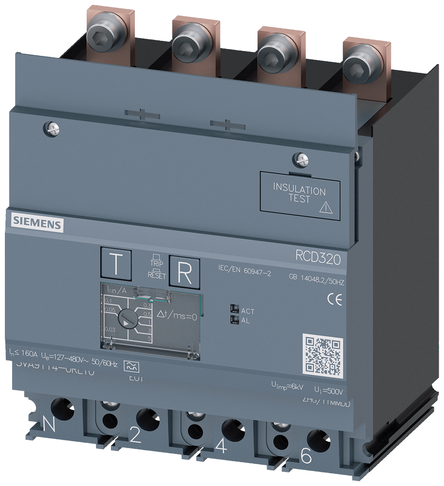 dispositivo di protezione differenziale RCD320 Basic RCD Tipo A montato in basso corrente di guasto nominale 0,03 ... 5 A a 50/60 Hz tempo regolabile a 4 poli In=160A Ue=100-480V Accessori per: 3VA1 Interruttori automatici scatolati SENTRON 3VA - un sistema. Per tutte le applicazioni.