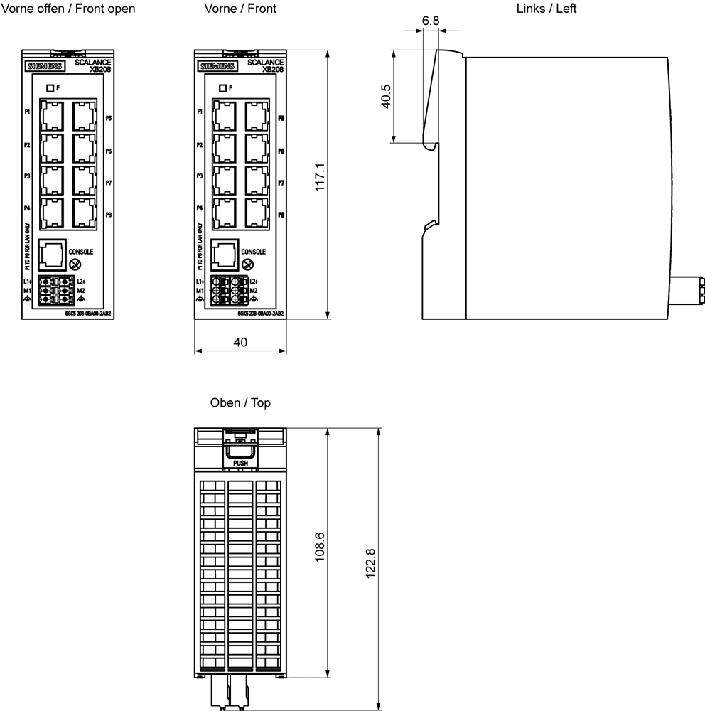 SCALANCE XB208 manageable Layer 2 IE Switch 8x porte RJ45 da 10/100 Mbit/s 1x porta di console; LED di diagnostica alimentazione di tensione ridondante certificato IEC 62443-4-2; campo di temp. 0°C ... +60°C; montaggio su guida profilata; PROFINET predefinito. SCALANCE XB208 managed, box switch di Layer 2, 8x RJ45 da 10/100 Mbit/s per PROFINET ed EtherNet/IP, default: applicazioni PROFINET ed EtherNet/IP. Indicato per numerose applicazioni: Lo SCALANCE XB208 offre unampia varietà di switch Ethernet altamente performanti in diverse varianti: dagli switch Gigabit agli switch robusti per i requisiti dellautomazione discreta e di processo. I potenti switch Gigabit SCALANCE XB208 sono stati sviluppati per rispondere ai difficili requisiti delle reti negli ambienti industriali. Grazie allhardware potente e alle funzioni avanzate, assicurano uninfrastruttura di rete affidabile e scalabile per qualsiasi applicazione. Realizzazione semplice e affidabile di molte applicazioni industriali.