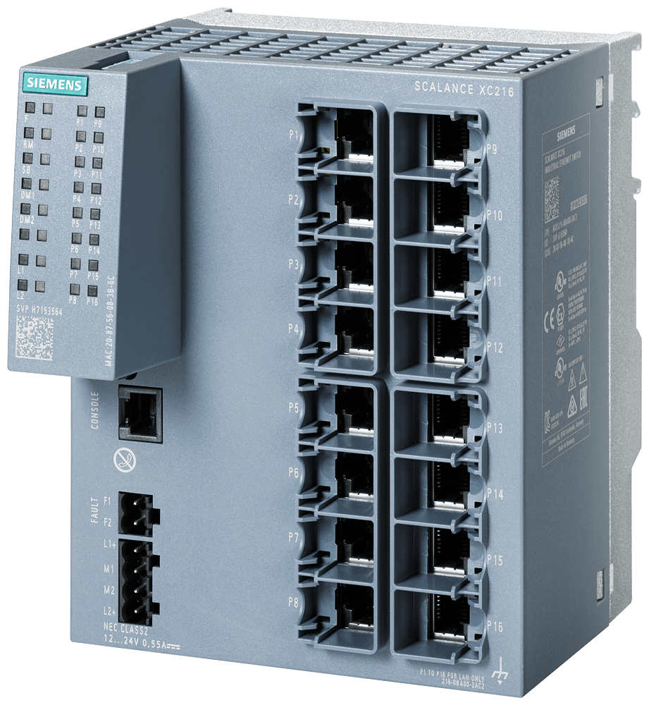 SCALANCE XC216 manageable IE Switch di Layer 2; certificato IEC 62443-4-2; 16X porte RJ45 10/100 Mbit/s; 1x porta di console, LED di diagnostica; alimentazione di tensione ridondante; campo di temp.-40 °C...+70 °C; montaggio: guida DIN/profilata S7/a parete funzioni di ridondanza Office Features (RSTP, VLAN,...); PROFINET IO Device; conforme a Ethernet/IP; slot C-PLUG; SCALANCE XC216 managed, switch compatto di Layer 2, 16x RJ45 da 10/100 Mbit/s per Industrial Ethernet (PROFINET ed EtherNet/IP). Indicatoper numerose applicazioni: Lo SCALANCE XC216 offre unampia varietà di switch Ethernet altamente performanti in diverse varianti: dagli switch Gigabit agli switch robusti per i requisiti dellautomazione discreta e di processo. I potenti switch Gigabit SCALANCE XC216 sono stati sviluppati per rispondere ai difficili requisiti delle reti negli ambienti industriali. Grazieallhardware potente e alle funzioni avanzate, assicurano uninfrastruttura di rete affidabile e scalabile per qualsiasi applicazione. Realizzazione semplice e affidabile di molte applicazioni industriali.
